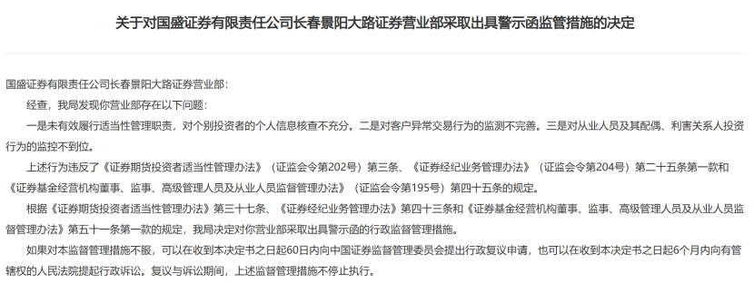 据吉林证监局5月15日披露,国盛证券有限责任公司长春景阳大路证券营业部被出具警示函。